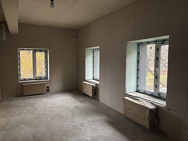 Помещение уже разделено на 5 отдельных комнат с окнами, в каждой есть мокрая точка.