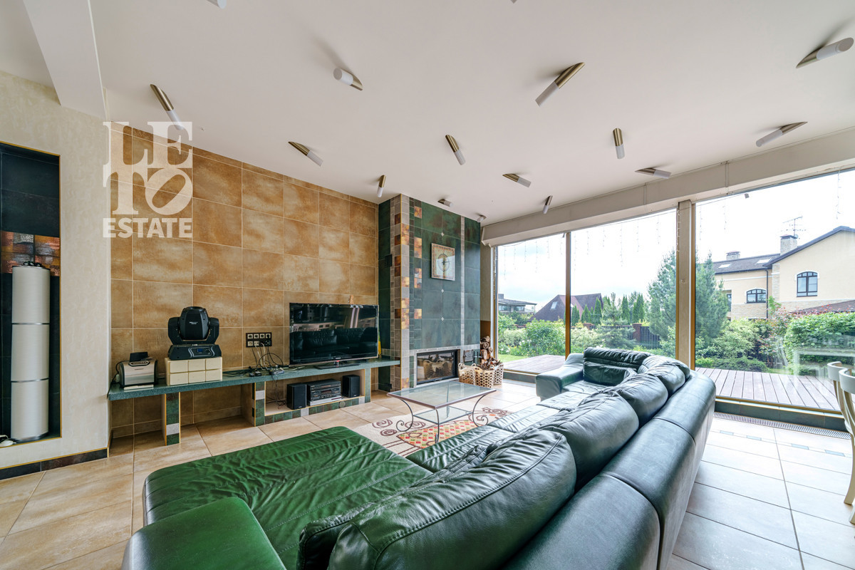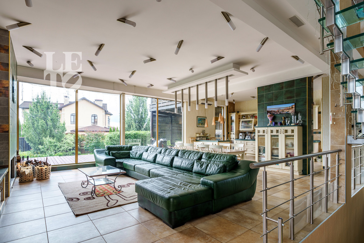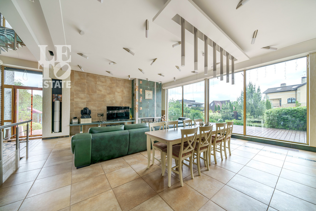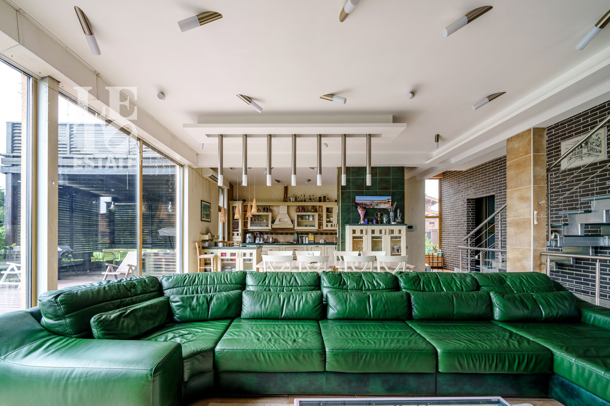Внутренняя отделка соответствует общей стилистике дома. В доме выполнен дизайнерский ремонт в современном стиле. Пол первого этажа полностью отделан плиткой и оснащен функцией обогрева. В комнатах второго этажа напольным покрытием служит натуральное дерево. В доме предусмотрено место для помпового лифта. Центром притяжения является межэтажная лестница со стеклянными ступенями и просторная кухня-гостиная, выдержанная в единой цветовой и стилистической гамме. Благодаря панорамному остеклению в доме всегда много света и воздуха.