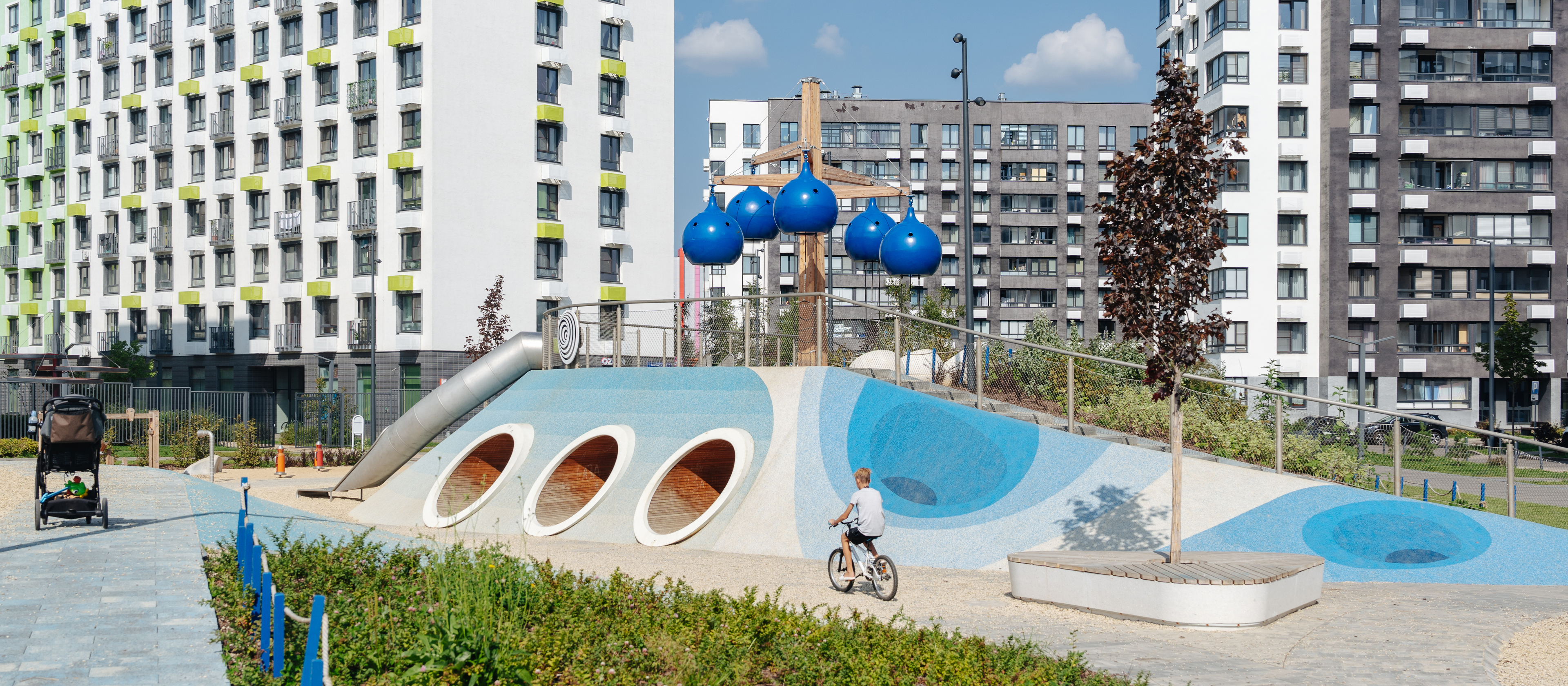 Через квартал протянется широкий пешеходный бульвар для прогулок и отдыха. Уже открыт ПлейХаб «Гравити» — большая игровая площадка для детей разного возраста с лазательным комплексом, песочной станцией и зонами отдыха для родителей. На первых этажах домов работают магазины, кафе и полезные сервисы. А на парковке установлены зарядные станции для электрокаров.