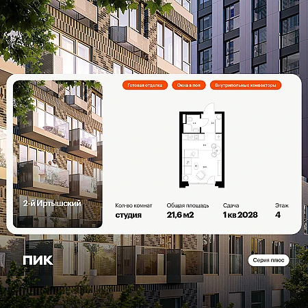 Продаётся квартира-студия площадью 21.60 кв.м на 4 этаже 16 этажного дома (Корпус 1.4, секция 4) проекта ПИК 2-й Иртышский. Светлый просторный подъезд на уровне земли, функциональная планировка, большие окна, с отделкой.