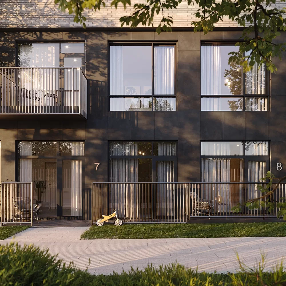 Лобби на первых этажах домов выполнены в стиле современного минимализма: кирпич сочетается с мраморным бесшовным полом из наливного материала терраццо, гладкой плиткой и стеклом. Здесь появятся зоны ожидания, скоростные лифты и помещение для хранения колясок и велосипедов.