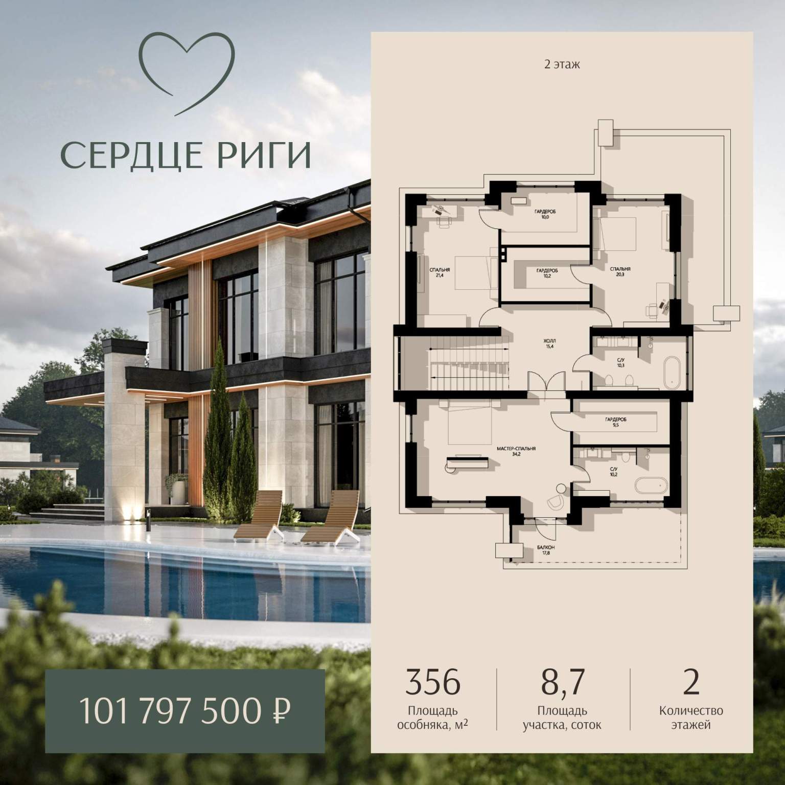 Продается дом общей площадью 356.5 м на участке 8.7 соток в коттеджном поселке СЕРДЦЕ РИГИ, всего в 18 км от МКАД.