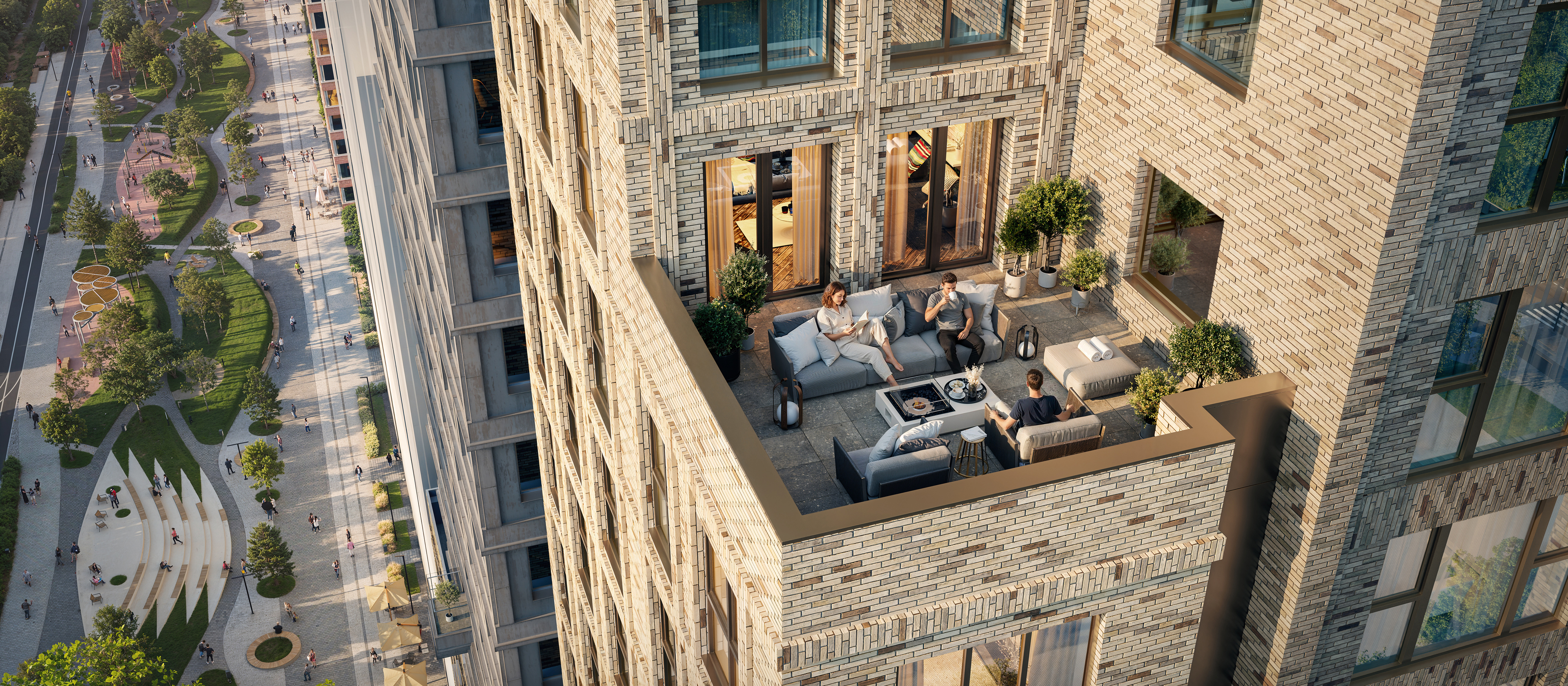 Лобби на первых этажах домов выполнены в стиле современного минимализма: кирпич сочетается с мраморным бесшовным полом из наливного материала терраццо, гладкой плиткой и стеклом. Здесь появятся зоны ожидания, скоростные лифты и помещение для хранения колясок и велосипедов.