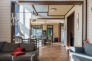 У дома кровля - металлочерепица, окна - тройные стеклопакеты. В доме на первом этаже: кухня-столовая, гостиная с панорамными окнами, с выходом на террасу, гостевая спальня, санузел, гардеробная комната.