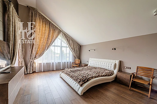 У дома мягкая кровля, окна - тройные стеклопакеты. В доме уютная гостиная с камином, оборудованная кухня-столовая, 5 спален, 4 гардеробные комнаты, кабинет, 4 с/у, сауна, балкон, веранда, подвал. Чистый и светлый дом полностью меблирован, оборудован всей необходимой техникой.