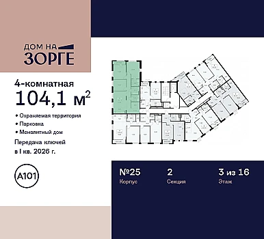 Продается 3-комнатная квартира от застройщика: общая площадь 94.10 м, жилая 44.60 м, кухня 18.70 м, 18-й этаж, жилой квартал «Вдохновение», корпус 32 (секция 1) . Срок сдачи: 4 квартал 2027 года.