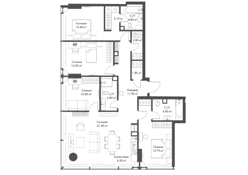 4 совмещенных санузла. В жилой зоне 2 больших окна на одну сторону, хорошая инсоляция.