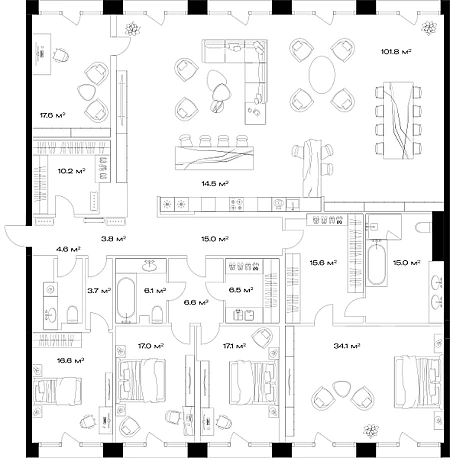 4 совмещенных санузла. В жилой зоне 2 больших окна на одну сторону, хорошая инсоляция.