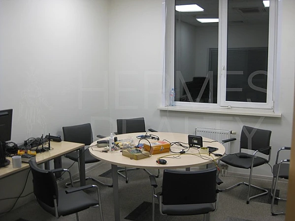 Коммуникации: Санузел в блоке, мини-кухня (холодильник, СВЧ, раковина), принтерная зона, гардероб с кабинками для переодевания, встроенные шкафы.