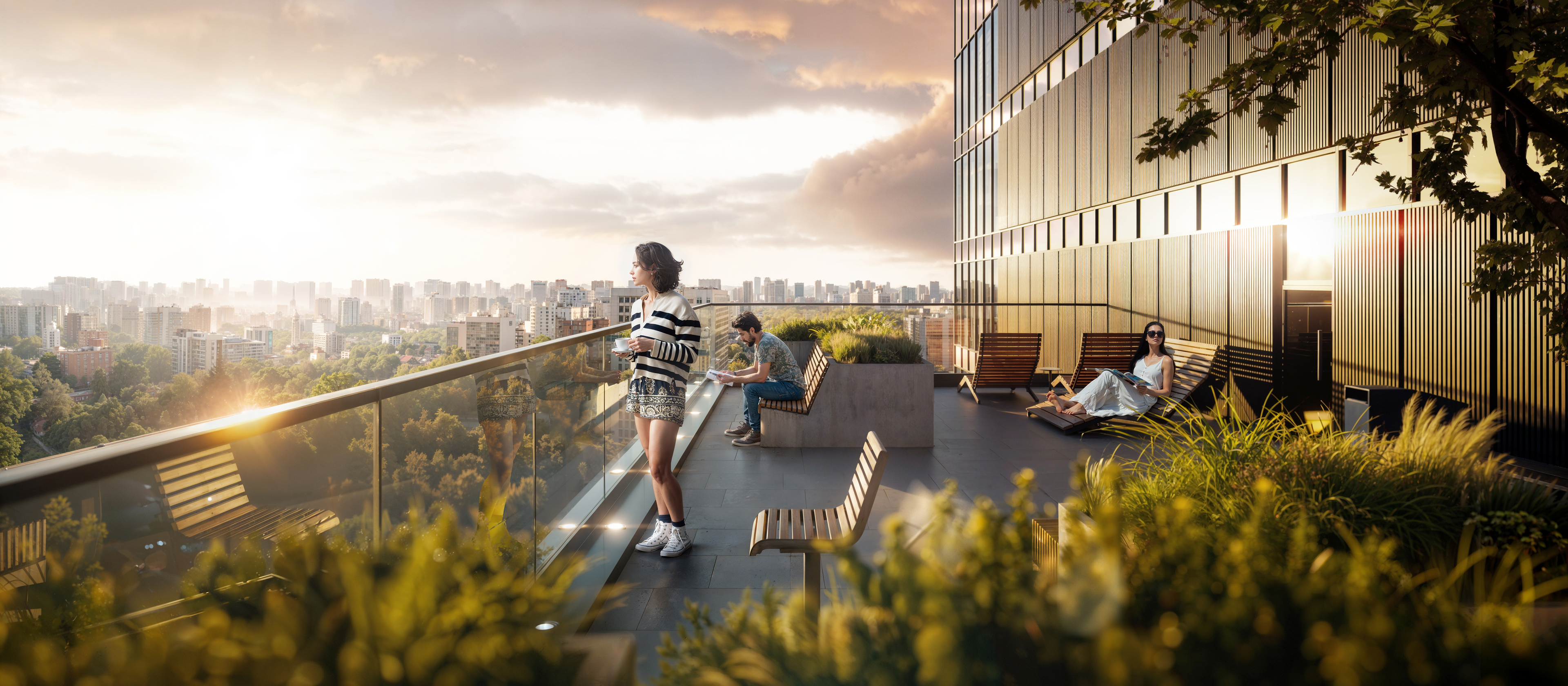 В корпусе 1.4 появится общественная терраса на 30-м этаже. Доступ сюда есть только у жителей, поэтому вы не встретите в этом пространстве посторонних людей. Здесь можно заниматься спортом, отдохнуть за чтением книги или создать собственный сад. А ещё отсюда открываются красивые виды на город.