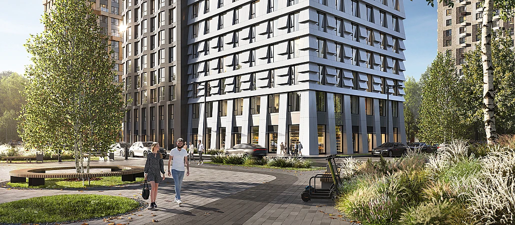 Проектом предусмотрены входы на уровне земли, без ступеней, порогов и пандусов — так удобнее и безопаснее. У подъездов будет два выхода: на улицу и во двор-парк. В наших дворах мы установим столы и лавочки со встроенными зарядными устройствами. Не нужно будет возвращаться домой, чтобы зарядить смартфон или ноутбук: можно весь день работать на свежем воздухе.