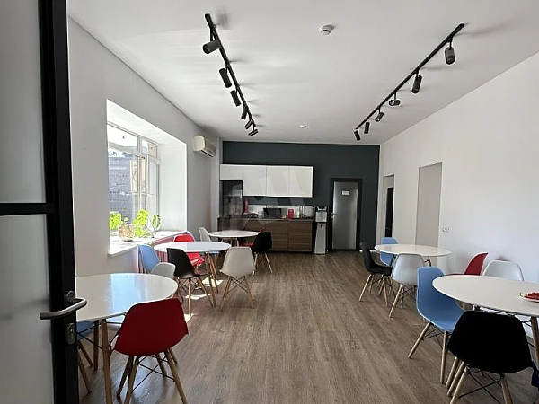 Офис находится в сервисном офисном пространстве с мини-кухней и двумя переговорными комнатами. (Бесплатное пользование переговорками, чай/кофе).