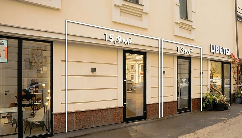 Располагается на первой линии домов по Новослободская улице. Окно-витрина, место на фасаде под вывеску. Высота потолков 3.4 метра.