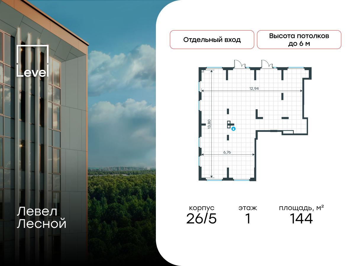 Продаётся коммерческое помещение свободного назначения площадью 144.00 м² в корпусе 1 дома 26 строящегося жилого комплекса комфорт-класса Левел Лесной. Сдача дома 26 запланирована на III квартал 2027 г. Проект расположен в зелёной зоне ближайшего Подмосковья, посёлке Отрадное. Развитая инфраструктура и уже заселённые корпуса делают этот проект перспективным для бизнеса.