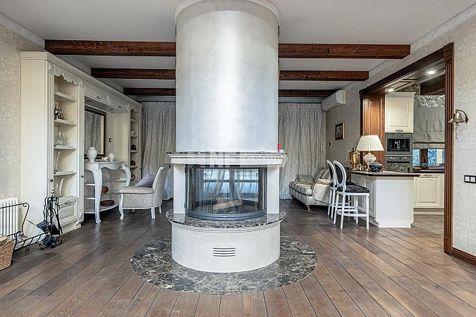 Второй этаж отведен под приватные помещения: хозяйский блок со спальней, камином и санузлом, дополненный кабинетом и гардеробом; две спальни с санузлами и гардеробными, каждая с балконом-лоджией.