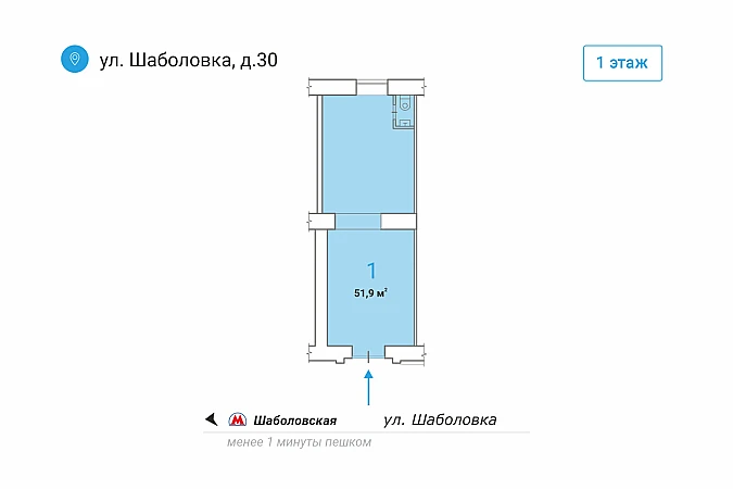 Здание расположено у выхода из станции метро Шаболовская. Интенсивные пешеходный и автомобильный трафики. Развитая инфраструктура, крупный жилой район. Описание помещения: Отдельная входная группа с фасада.