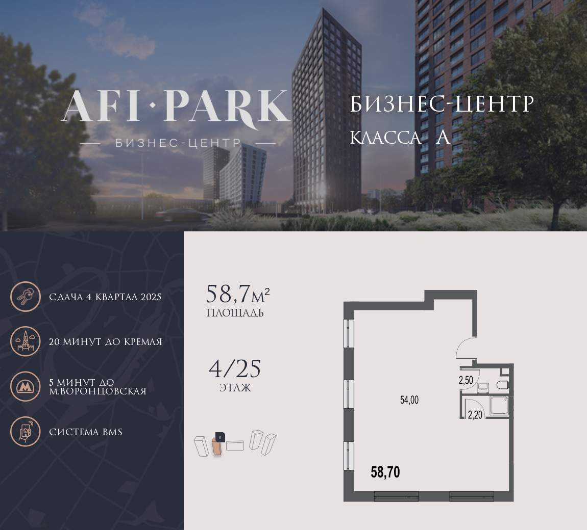 Купить офис 58 м² в МФК AFI Park Воронцовский