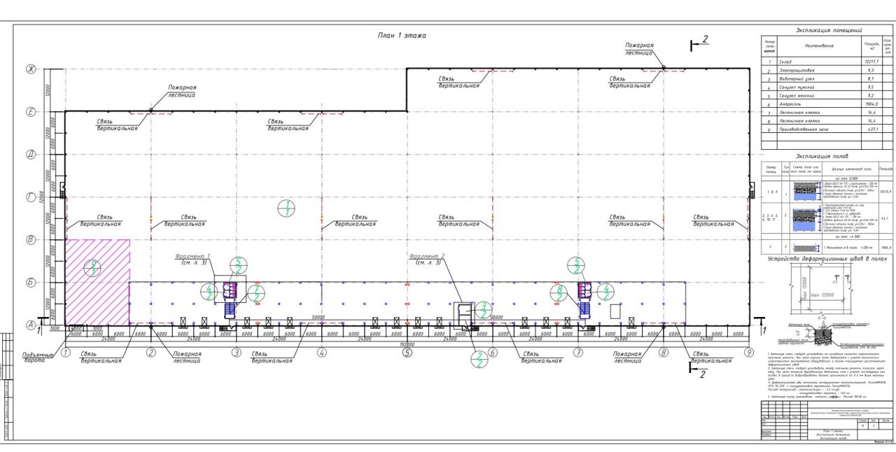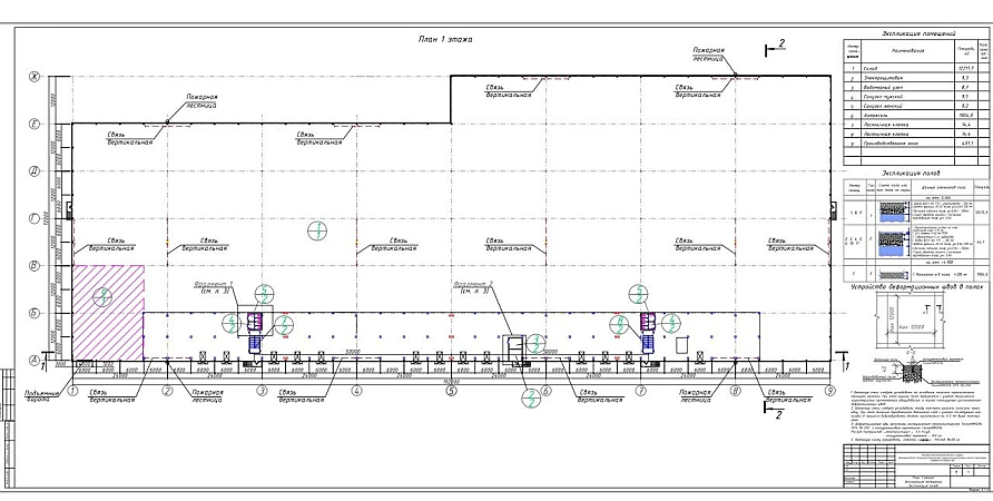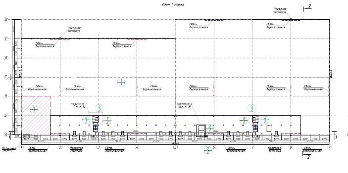 14 ворот докового типа. Шаг колонн - 12 на 24 м.