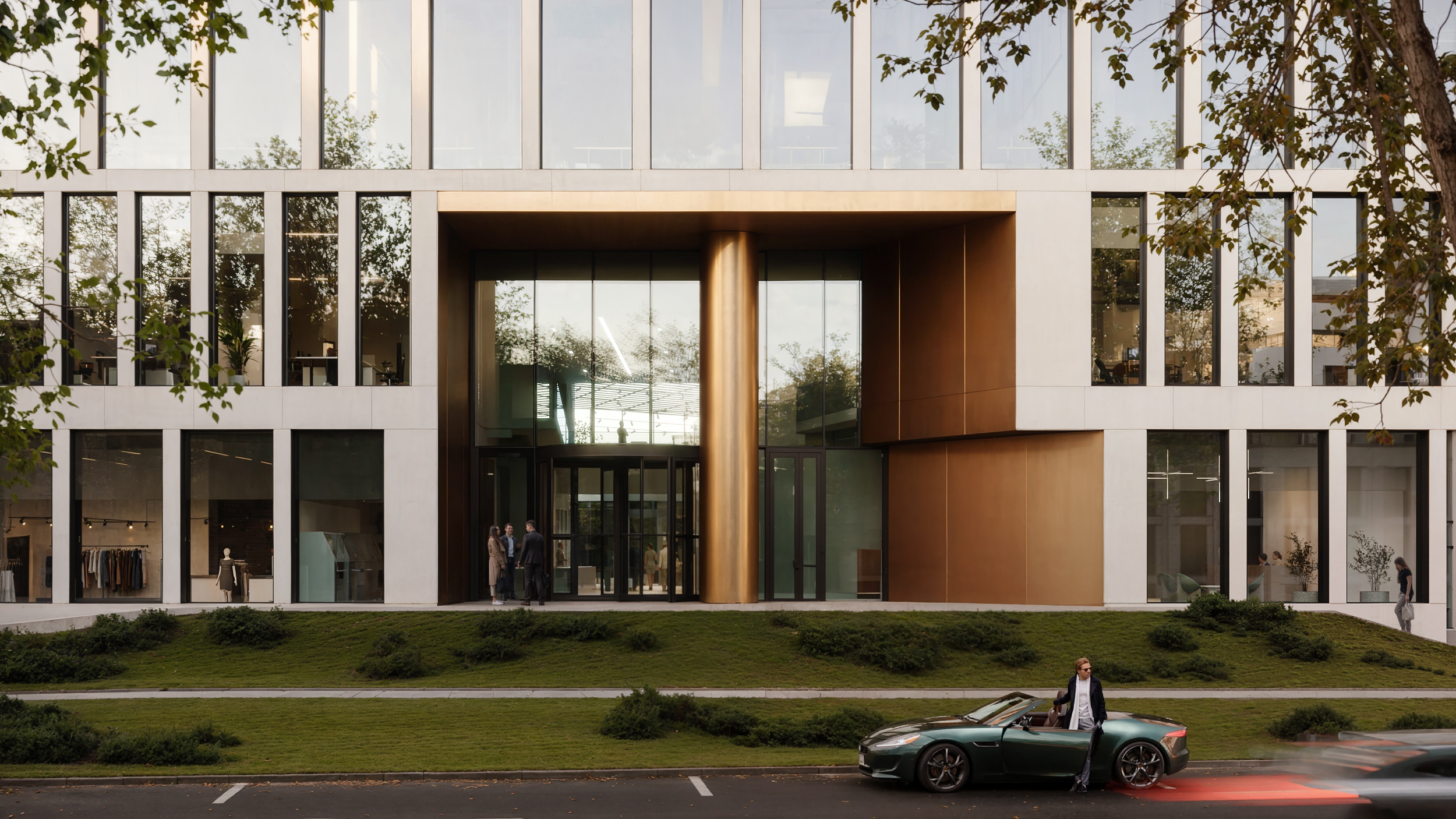 - Пешеходные маршруты, повторяющие геометрию террас бизнес-центра;