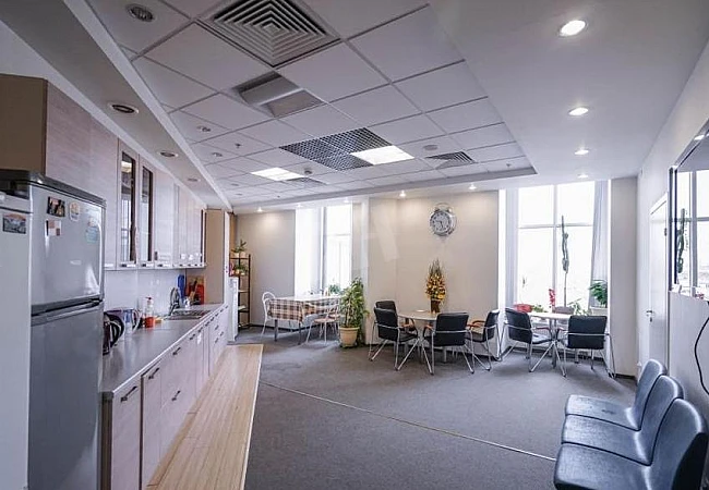 Помещение большой площади характеризуется просторной и светлой планировочной структурой смешанного типа. В составе офиса предусмотрены кабинеты, переговорные комнаты, санузлы, кухонная зона, зона руководства и ресепшен. Высота потолков составляет 3,3 метра.