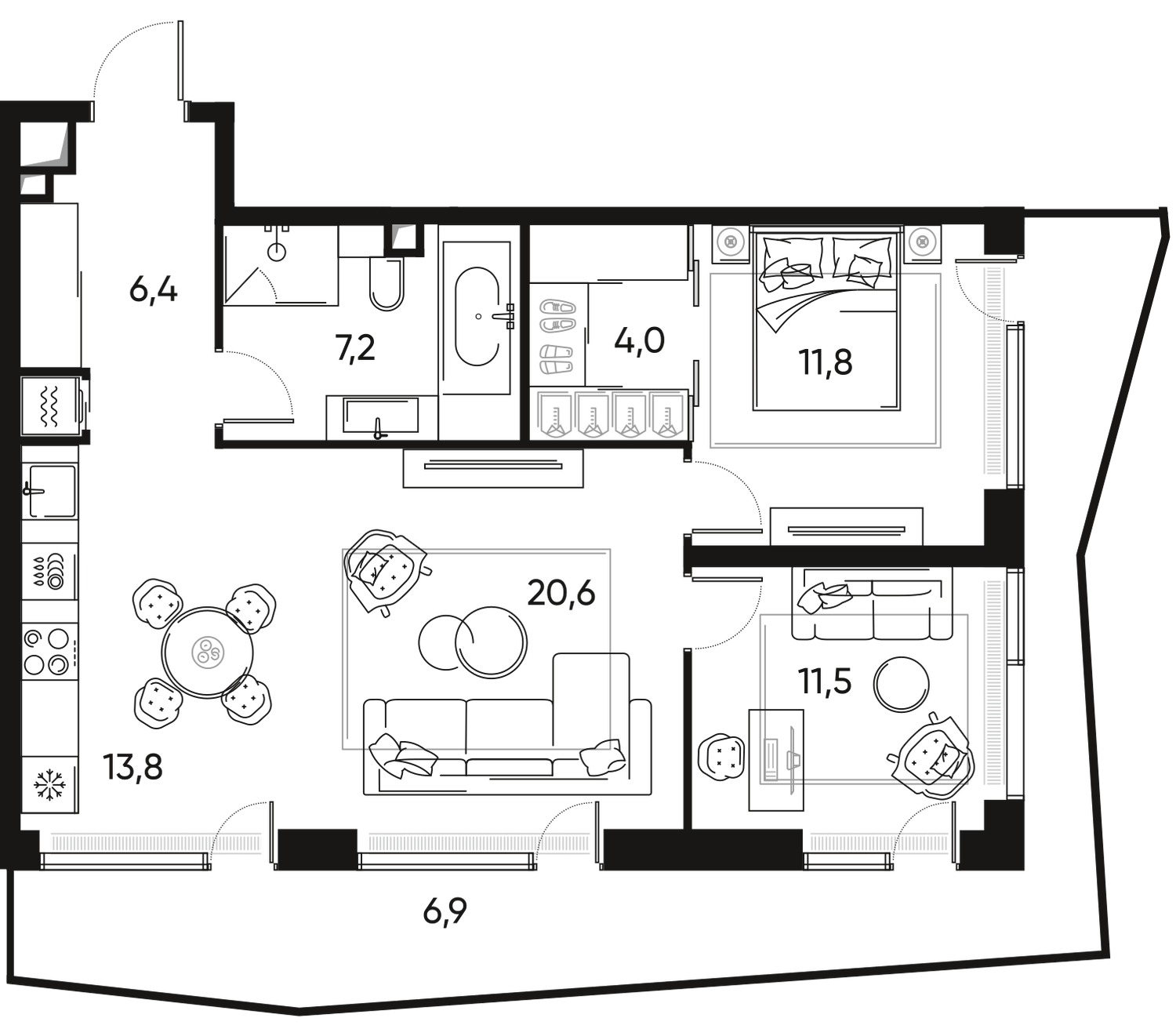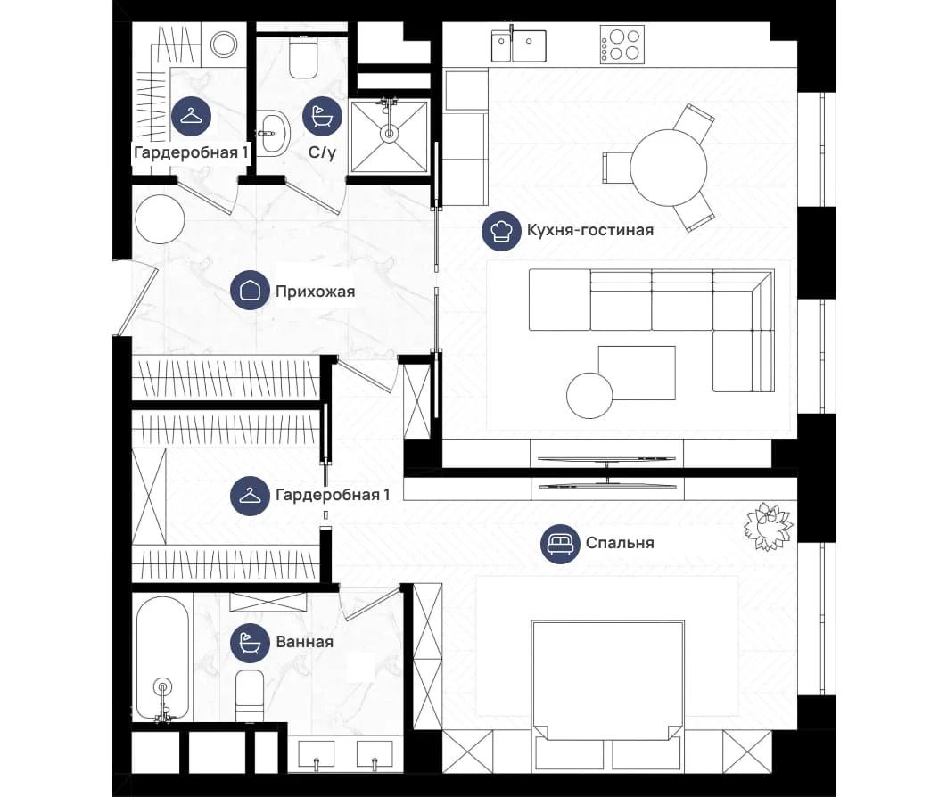 Функциональная планировка квартиры, разработанная по индивидуальному дизайн-проекту: кухня, переходящая в просторную гостиную с обеденной зоной, мастер-спальня с выходом в санузел с ванной, вторая спальная комната, отдельная гардеробная комната, второй гостевой санузел, холл с местами для хранения.