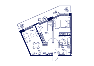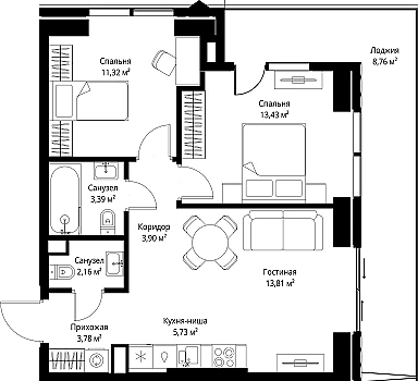1 совмещенный санузел. В жилой зоне 2 больших окна на одну сторону, хорошая инсоляция.