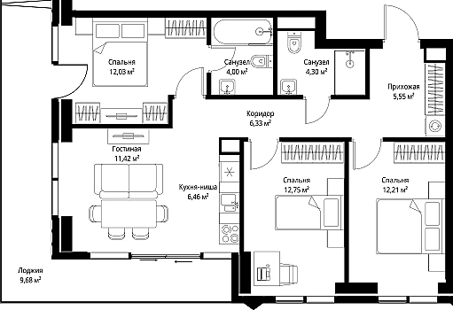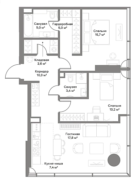 3 санузла (1 раздельный и 2 совмещенных) . В жилой зоне 2 больших окна на одну сторону, хорошая инсоляция.