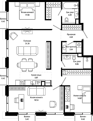 Продаётся 3-комн. квартира от застройщика: общая площадь 89.70 м, жилая 32.80 м, кухня 28.80 м, 18-й этаж, жилой квартал «Остров 7», корпус 7 (секция 2) . Срок сдачи: 3 квартал 2028 года.