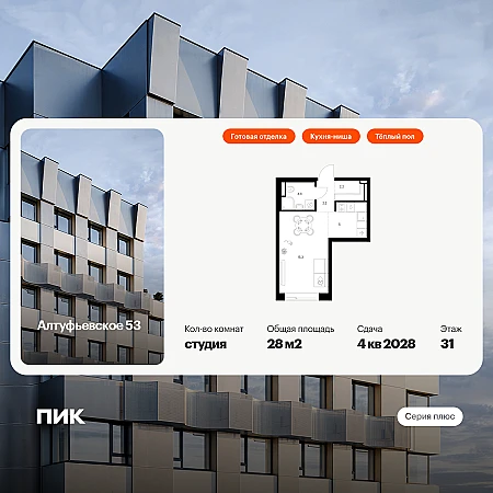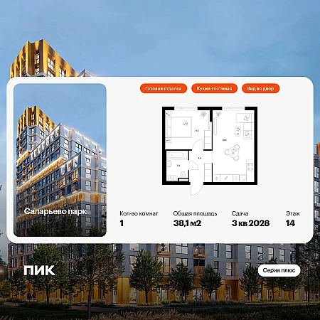 Продаются 1-к апартаменты площадью 36.6 кв.м. на 10-м этаже 33 этажного дома в ЖК "Мираполис" от ГК ОСНОВА.