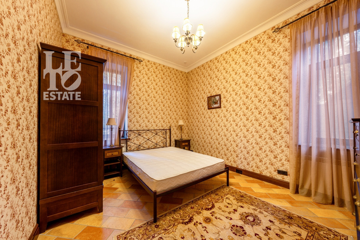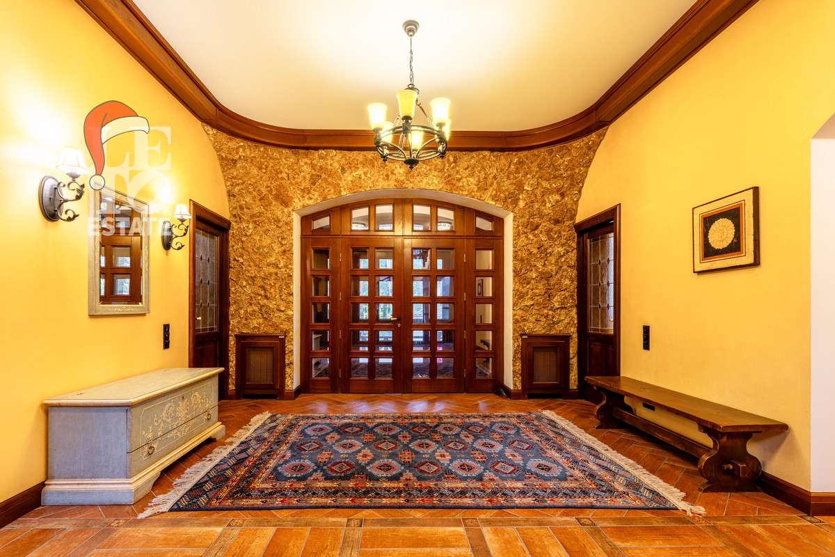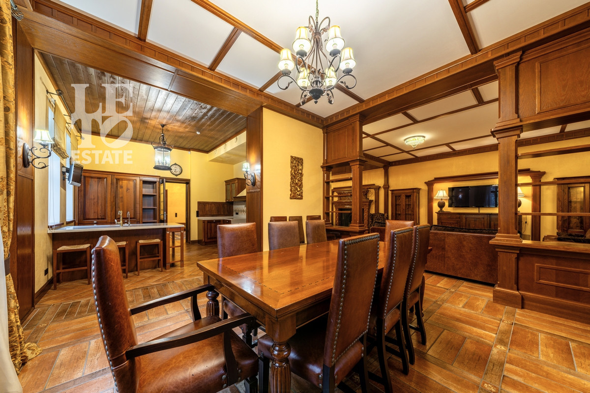 Интерьер: Оформлен в уютном стиле английского кантри. Теплая цветовая гамма, деревянные балки, паркет и камин создают атмосферу респектабельного и неспешного загородного быта.
