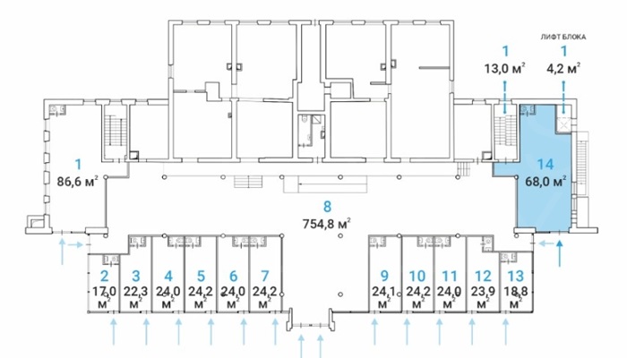 Торговое помещение 68 м² на 1 этаже. Высота потолков 3,5 м. Ж/б перекрытия. Витринное остекление.
