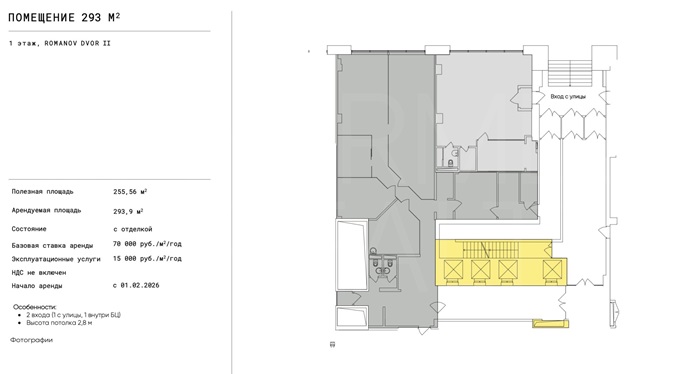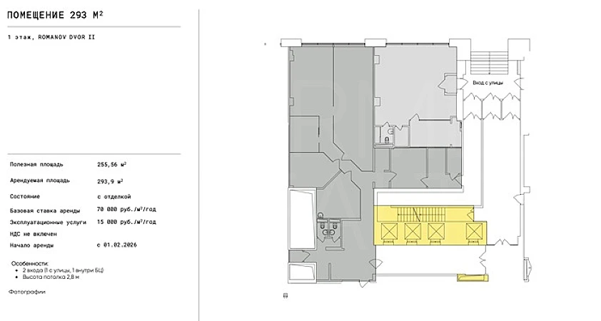 Аренда офиса 293,9 м² у м. Библиотека им. Ленина (ЦАО)Расположение:Москва, ЦАО, р-н Арбат, пер. Романов, 4с2Бизнес-центр «Романов Двор 2», 1-й этажТранспорт:🚇 Библиотека им. Ленина — 5 мин. пешком🚇 Охотный ряд — 6 мин. пешком🚇 Александровский сад — 6 мин. пешком🚇 Боровицкая — 8 мин. пешкомОписание помещения:🔹 Площадь: 1 этаж - 293,9 м²🔹 Состояние: Офисная отделка 🔹 Коммуникации:▫️ Высота потолков: 2,8 м▫️ Мощность: 80 Вт/м² (два независимых ввода)▫️ Двухтрубная система вентиляции и кондиционирования с шумоподавлением▫️ 7 независимых провайдеров▫️ Система адресной пожарной сигнализации и спринклерное пожаротушениеИнфраструктура:✅ Парковка на 300 мест с зарядками для электромобилей✅ Круглосуточная безопасность (видеонаблюдение с Face Tracking)✅ 5 лифтовых групп Tyssen для офисов, 2 VIP-лифта✅ Дизель-генератор для серверных арендаторов✅ Вело-мото-парковкиКлючевые преимущества:📍 Исключительное расположение в историческом центре Москвы🔄 Высокотехнологичная инфраструктура премиум-класса📍 2 входа (1 с улицы, 1 внутри БЦ) Условия аренды:• Налогообложение: НДС не включен• Тип сделки: Прямая аренда• Готовность к въезду: с 01.02.2026Помещения премиум-класса в одном из самых статусных бизнес-центров Москвы с готовой инфраструктурой для ведения бизнеса высшего уровня. Идеально для головного офиса респектабельной компании, требующей представительности, технологичности и максимальной транспортной доступности.Звоните для организации просмотра и уточнения деталей! Объект №3100-981659.