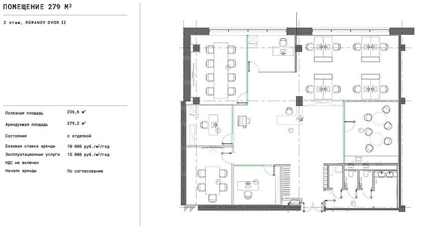 Аренда офиса 279,2 м² у м. Библиотека им. Ленина (ЦАО)Расположение:Москва, ЦАО, р-н Арбат, пер. Романов, 4с2Бизнес-центр «Романов Двор 2», 2-й этажТранспорт:🚇 Библиотека им. Ленина — 5 мин. пешком🚇 Охотный ряд — 6 мин. пешком🚇 Александровский сад — 6 мин. пешком🚇 Боровицкая — 8 мин. пешкомОписание помещения:🔹 Площадь: 2 этаж - 279,2 м²🔹 Состояние: Офисная отделка 🔹 Коммуникации:▫️ Высота потолков: 2,8 м▫️ Мощность: 80 Вт/м² (два независимых ввода)▫️ Двухтрубная система вентиляции и кондиционирования с шумоподавлением▫️ 7 независимых провайдеров▫️ Система адресной пожарной сигнализации и спринклерное пожаротушениеИнфраструктура:✅ Парковка на 300 мест с зарядками для электромобилей✅ Круглосуточная безопасность (видеонаблюдение с Face Tracking)✅ 5 лифтовых групп Tyssen для офисов, 2 VIP-лифта✅ Дизель-генератор для серверных арендаторов✅ Вело-мото-парковкиКлючевые преимущества:📍 Исключительное расположение в историческом центре Москвы⚡ Готовность к въезду🔄 Высокотехнологичная инфраструктура премиум-класса Условия аренды:• Налогообложение: НДС не включен• Тип сделки: Прямая арендаПомещения премиум-класса в одном из самых статусных бизнес-центров Москвы с готовой инфраструктурой для ведения бизнеса высшего уровня. Идеально для головного офиса респектабельной компании, требующей представительности, технологичности и максимальной транспортной доступности.Звоните для организации просмотра и уточнения деталей! Объект №3100-981660.