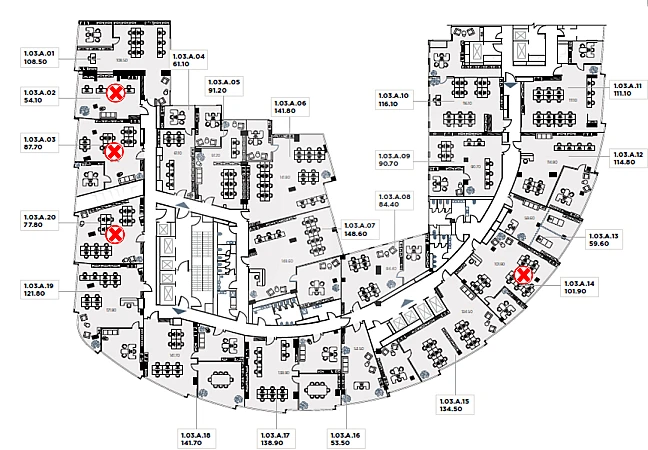 *Количество рабочих мест рассчитано автоматически: от 4,5 м2 на человека до 8 м2 на человека.