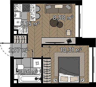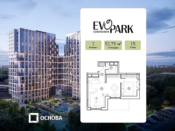 Продаются 2-к апартаменты площадью 50.75 кв.м. на 15-м этаже 20 этажного дома в EVOPARK Сокольники от ГК ОСНОВА.