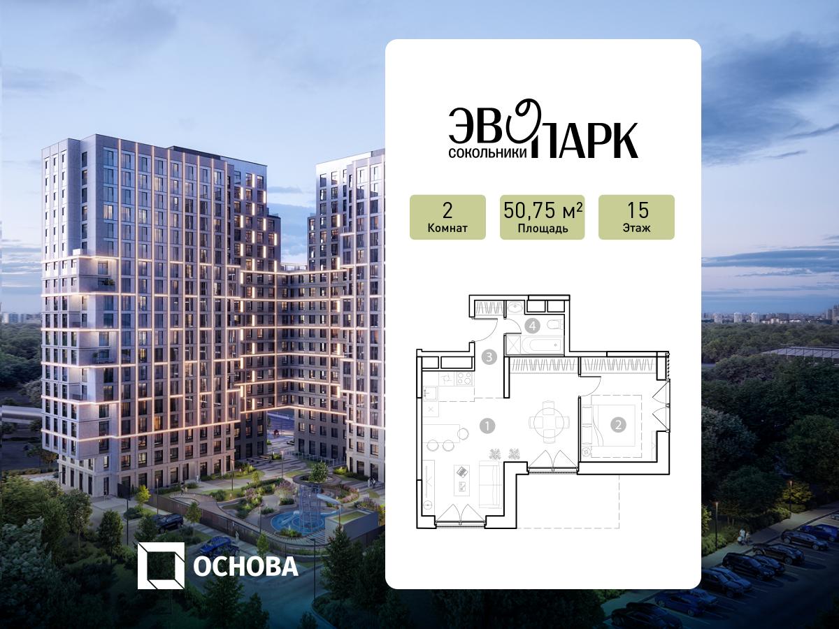 Продаются 2-к апартаменты площадью 50.75 кв.м. на 15-м этаже 20 этажного дома в ЭВОПАРК Сокольники от ГК ОСНОВА.