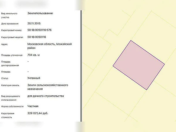 Земельный участок: кадастровый номер 50: 18: 0050116: 576, 704 кв. мКатегория земель: Земли сельскохозяйственного назначенияВид разрешенного использования: Для дачного строительства