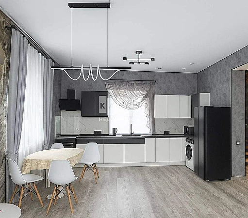 1 этаж - входная группа + просторная кухня гостиная с выходном на благоустроенный участок, где располагается бассейн + изолированная комната + санузел.
