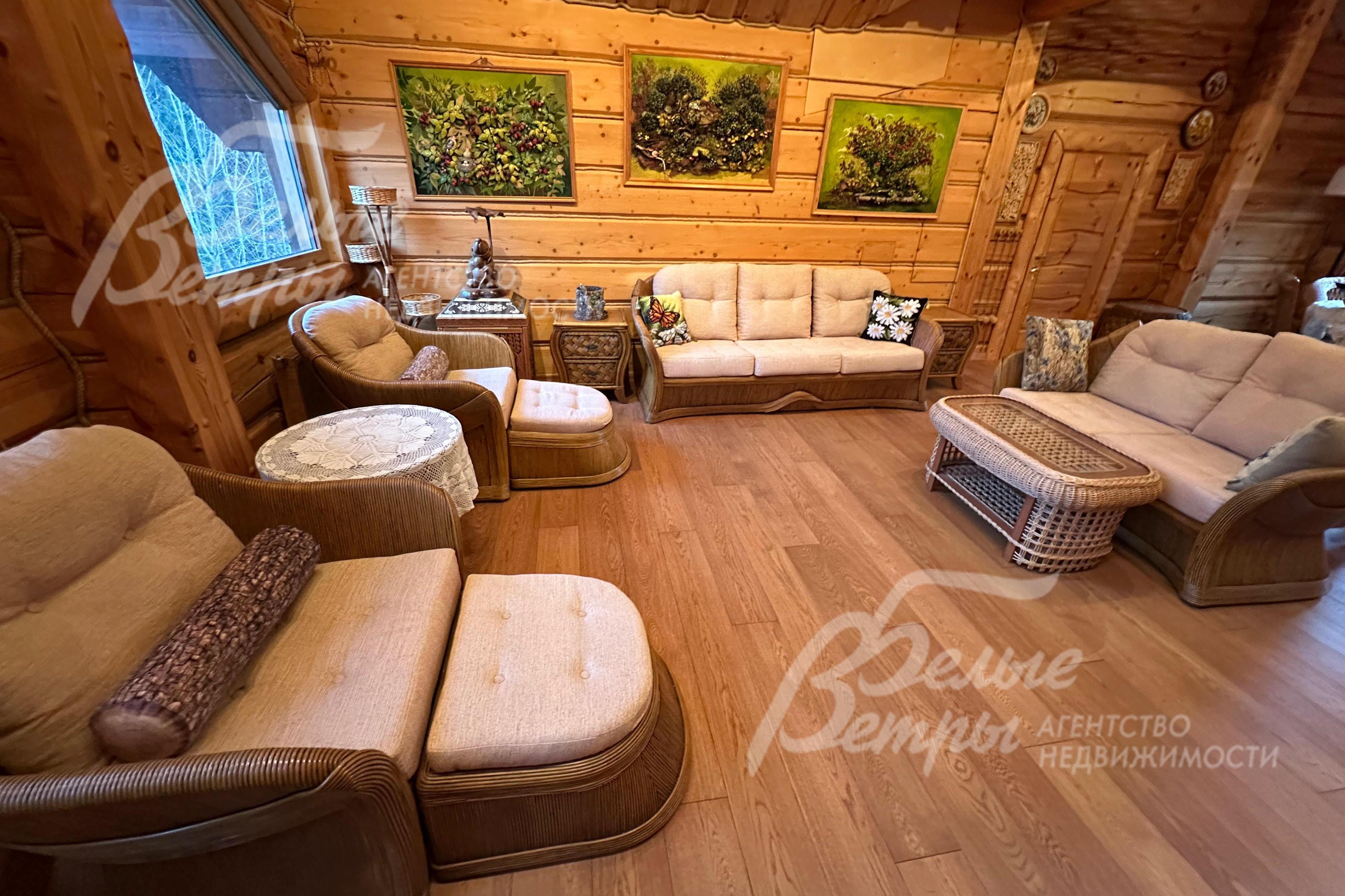 Мебель, оборудование: дом обставлен эксклюзивными предметами авторской мебели в духе традиционного русского зодчества: столы, стулья, комоды и другие элементы интерьера созданы по индивидуальному заказу из ценных пород древесины. Кухня выполнена из массива дерева и оснащена встроенной техникой Miele, а также установлено четыре холодильника, морозильник и вместительный винный шкаф в кладовой при кухне. В интерьере спален и гостиной – коллекция мягкой мебели Britannica. Мебельные композиции с элементами отделки из бересты гармонично перекликаются с оформлением спальных комнат, создавая единый стилистический ансамбль. Комфорт и оптимальные условия для отдыха обеспечивают кресла-реклайнеры с современным электроприводом, регулирующим механизм трансформации. Помещения украшают: коллекция деревянных птиц средней полосы России нижегородского мастера, уникальные авторские зеркала из бересты с инкрустацией полудрагоценными камнями, панно из дерева, выполненные в технике резьбы по дереву «Татьянка». В постирочной – стиральная и сушильная машины Miele, в санузлах – сантехника премиальных европейских брендов Sanitan (Великобритания), Grohe, Gustavsberg, деревянные душевые кабины, ванны, умывальники BentWood из лиственницы.