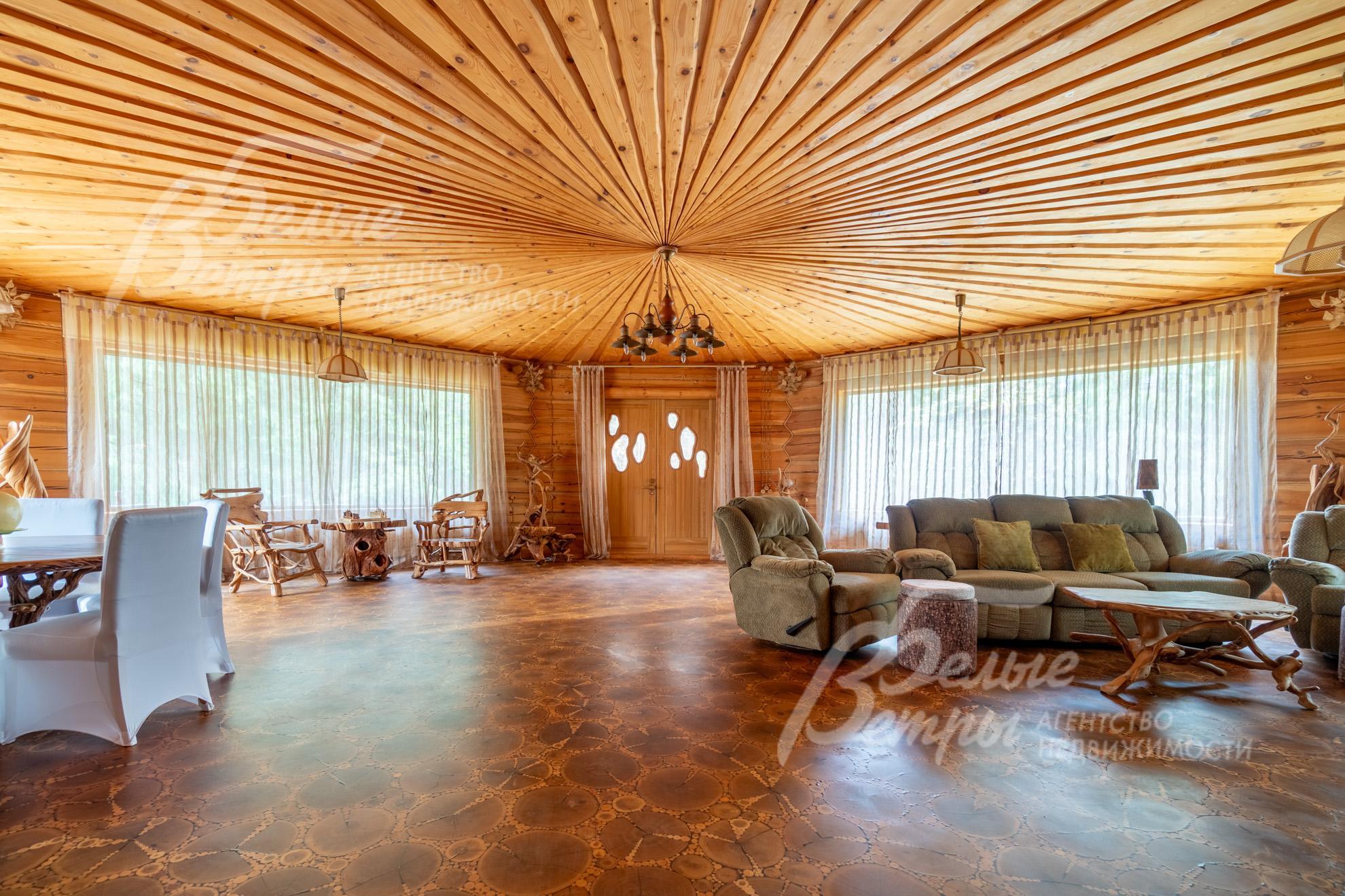Внутренняя отделка: внутренняя отделка дома выполнена в лучших традициях русского зодчества из ценных пород дерева, бересты – каждая деталь привлекает внимание: изящные наличники, эффектные потолочные карнизы, мебель и декор, созданные мастерами вручную. Стены отделаны эстетичным кедровым лафетом, между венцами проложен канат. На первом этаже уложен оригинальный наборный пол из спилов различных пород дерева, в спальнях – инженерная доска. Потолок выполнен из массива лиственницы. В гостиной потолок из кедра в виде лучей без единого стыка. Установлены межкомнатные двери из кедра, входные двери со световыми окнами, декорированные снаружи корой дерева. Интерьер дополняют выключатели в стиле «ретро» (разводка – наружная, открытая), пейзажная живопись, столики и тумбы из древесных ветвей. На верхние этажи ведут деревянные лестницы с художественным исполнением ограждения из веток и стволов дерева. На первом этаже и в санузлах – тёплые полы, интегрированы внутрипольные конвекторы Mohlenhoff с принудительной конвекцией. Пол террасы выложен архитектурным бетоном с имитацией среза пенька с заполнением промежутков по технологии «каменный ковер».