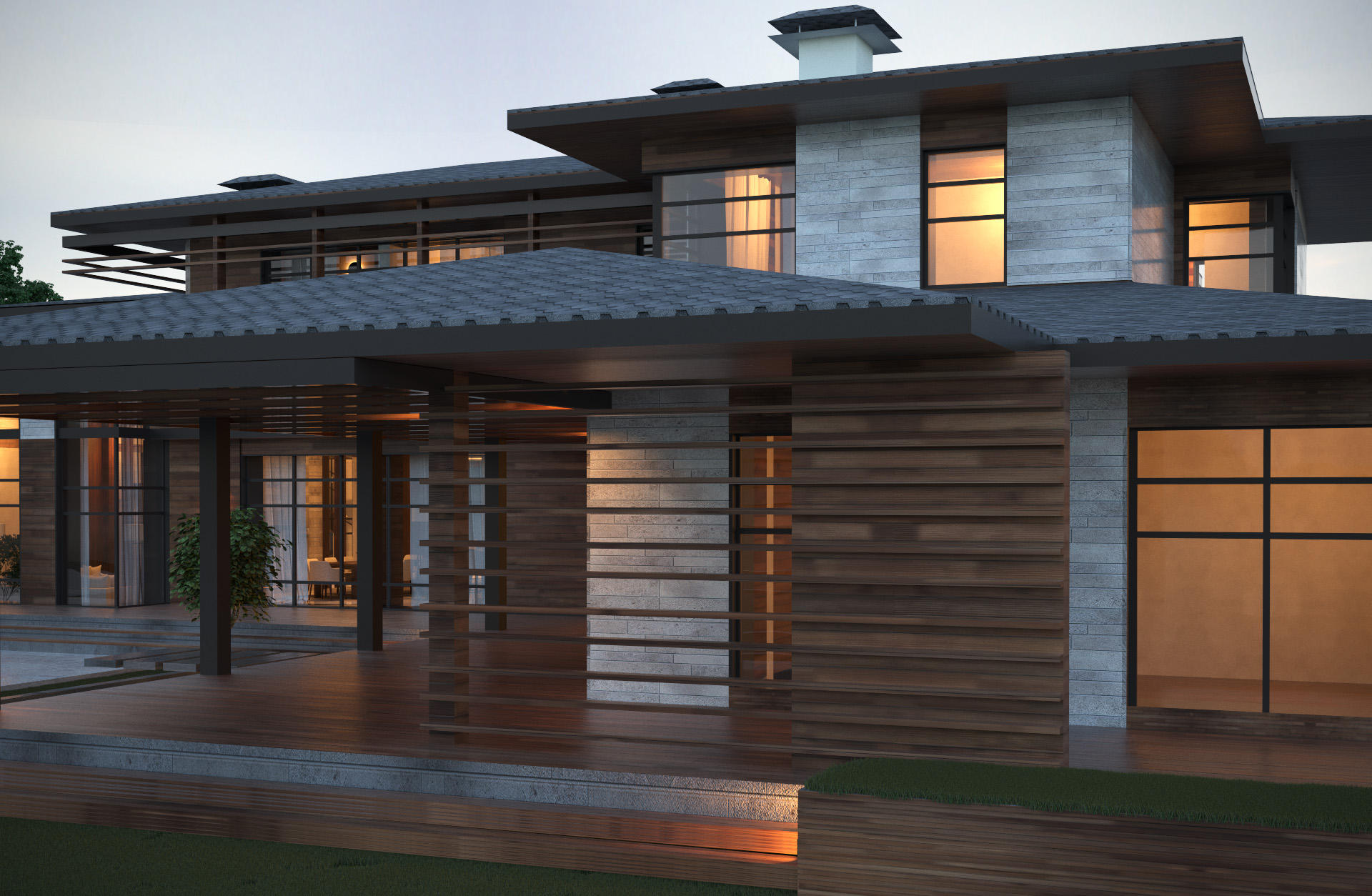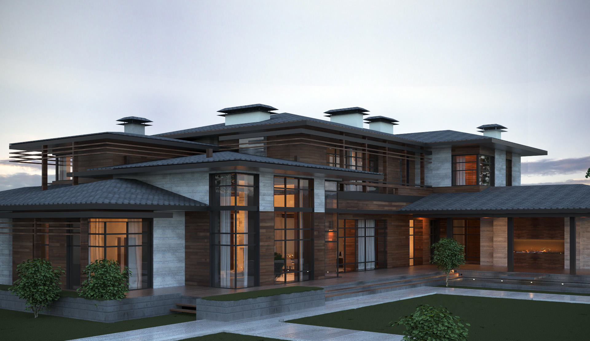 1-ый этаж: крытое крыльцо, прихожая 5 кв.м, гардеробная 4 кв.м, холл 27 кв.м, гостиная 84,5 кв.м с выходом на террасу 43 кв.м, кухня 16 кв.м, кладовая при кухне 16 кв.м, коридор 5,5 кв.м, коридор 11,5 кв.м, коридор 3,5 кв.м, спальня 22 кв.м с санузлом с душем 6,5 кв.м, коридор 3 кв.м, спальня 22 кв.м с санузлом с ванной 7,5 кв.м, коридор 3 кв.м, санузел 4 кв.м, гардеробная 11 кв.м.