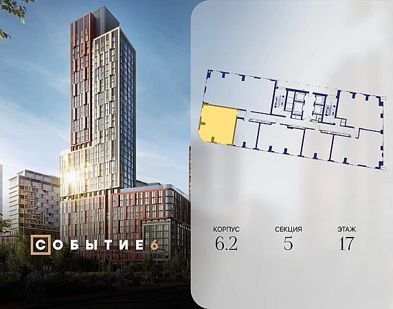 Продаётся 2-комнатная квартира от застройщика: общая площадь 64.60 м, жилая 26.80 м, кухня 20.70 м, 17-й этаж, жилой квартал «Событие-6», корпус 2 (секция 5) Срок сдачи: 1 квартал 2029 года.
