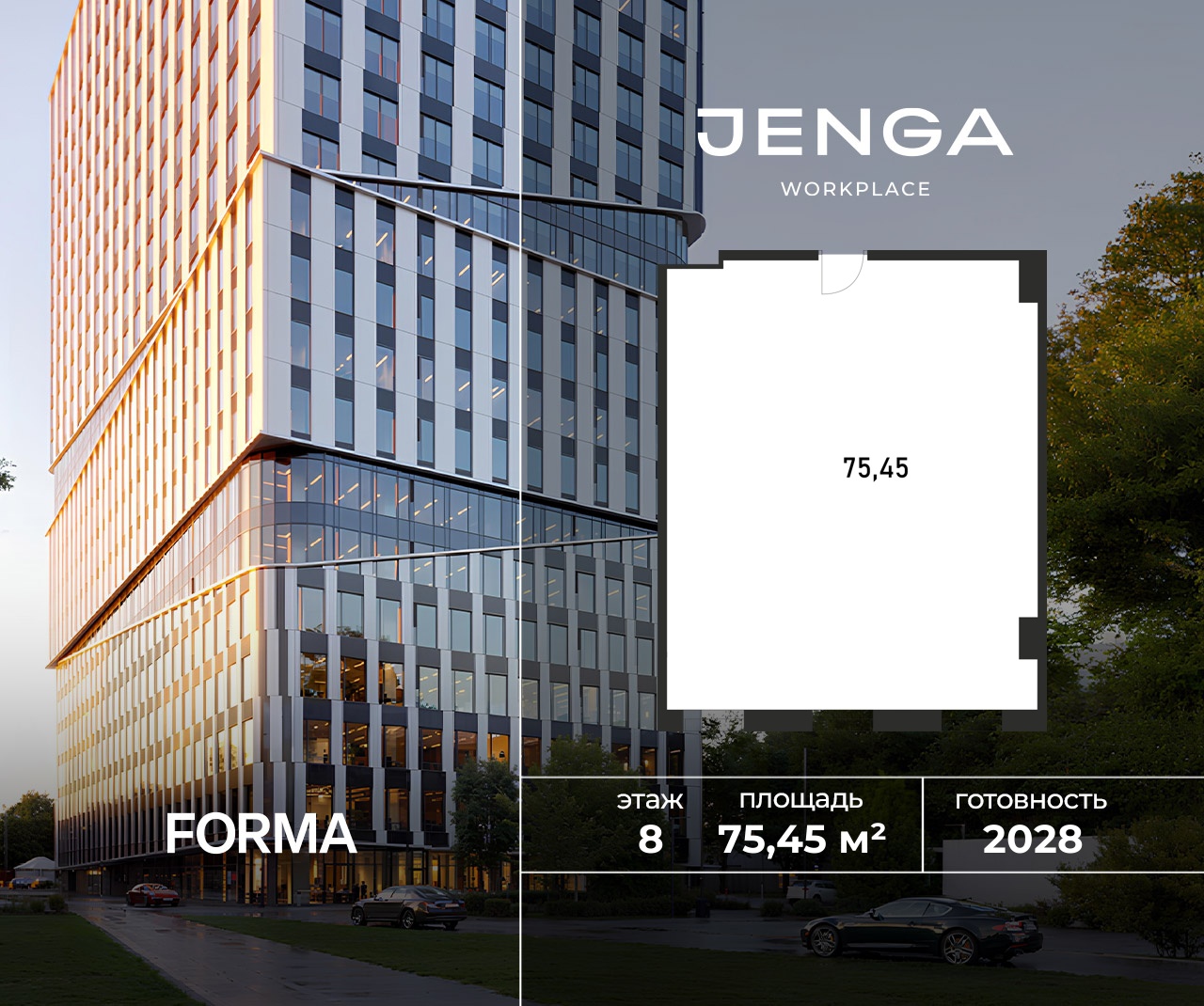 JENGA - новый workplace в районе Покровское-Стрешнево в 1 минуте пешком от станции МЦД «Щукинская». Пространство станет частью развивающейся деловой локации с развитой инфраструктурой и природой в непосредственной близости. Выгода до 25% в декабре. Цена указана при 100% оплате. • Общая площадь - 59 969 м²• Наземная площадь - 54 482 м²• Офисная площадь - 42 588 м²• Количество этажей - 23• Паркинг - 135 мест• Ввод в эксплуатацию - 3 квартал 2028 г.• До станции МЦД-2 «Щукинская» - 1 минута пешком• До станции метро «Щукинская» - 5 минут пешком Преимущества:• 14 минут до Белой площади, м. «Белорусская»• Экологически чистый район с множеством лесопарковых зон• Лобби с lounge-зoнoй, эспрессо-баром, meeting-зoнoй, банкоматами и постаматами• Панорамные виды на парк Покровское-Стрешнево и город
