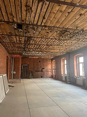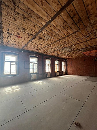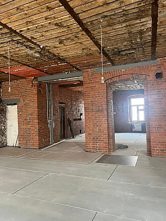 В помещении выполнена чистовая отделка в стиле "Лофт, идут работы по финальной установке напольного покрытия.