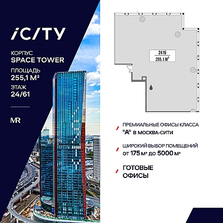 Предлагается офисное помещение, с рассрочкой 0%, площадью 255.1 м2 на 24 этаже в башне ""Space Tower"" деловых небоскребов класса ""А"" iCITY. Расположен в Москва-Сити. Проектом предусмотрена уникальная система проветривания помещений. Свободная планировка. Отделка Shell and Core. Высокие потолки 3,75 м и панорамное остекление обеспечивают отличную инсоляцию.
