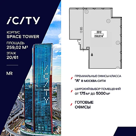 Предлагается офисное помещение, с рассрочкой 0%, площадью 259.02 м2 на 20 этаже в башне ""Space Tower"" деловых небоскребов класса ""А"" iCITY. Расположен в Москва-Сити. Проектом предусмотрена уникальная система проветривания помещений. Свободная планировка. Отделка Shell and Core. Высокие потолки 3,75 м и панорамное остекление обеспечивают отличную инсоляцию.