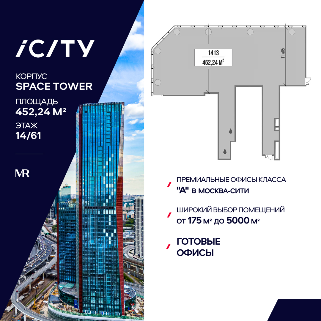 Предлагается офисное помещение, с рассрочкой 0%, площадью 452.24 м2 на 14 этаже в башне ""Space Tower"" деловых небоскребов класса ""А"" iCITY. Расположен в Москва-Сити. Проектом предусмотрена уникальная система проветривания помещений. Свободная планировка. Отделка Shell and Core. Высокие потолки 3,75 м и панорамное остекление обеспечивают отличную инсоляцию.