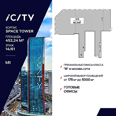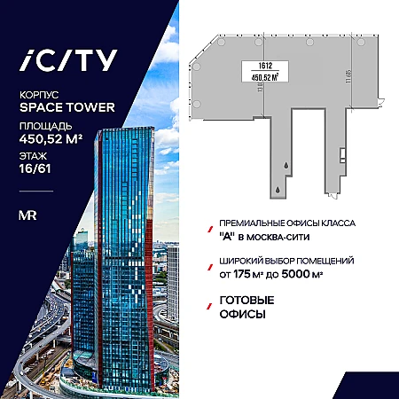 Предлагается офисное помещение, с рассрочкой 0%, площадью 450.52 м2 на 16 этаже в башне ""Space Tower"" деловых небоскребов класса ""А"" iCITY. Расположен в Москва-Сити. Проектом предусмотрена уникальная система проветривания помещений. Свободная планировка. Отделка Shell and Core. Высокие потолки 3,75 м и панорамное остекление обеспечивают отличную инсоляцию.