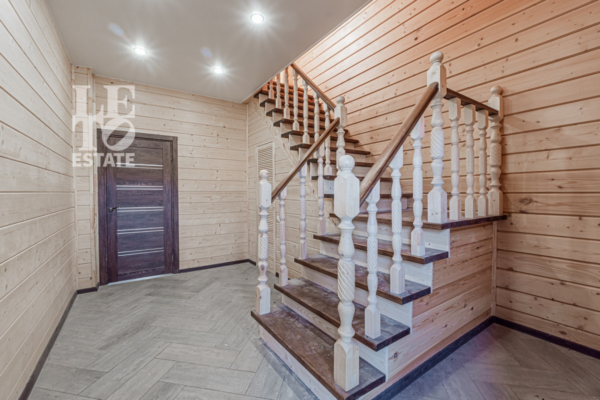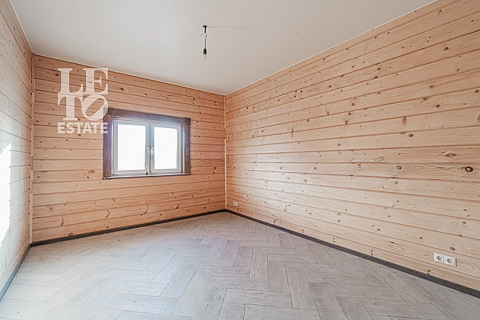 Внутренняя отделка соответствует общей стилистике дома. Стены в комнатах отделаны декоративным брусом, два санузла полностью в плитке. Пол первого этажа полностью отделан плиткой, оснащен функцией обогрева. В комнатах второго этажа на полу уложен ламинат.