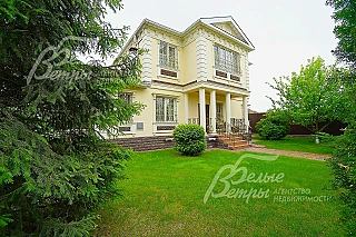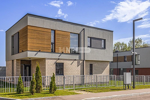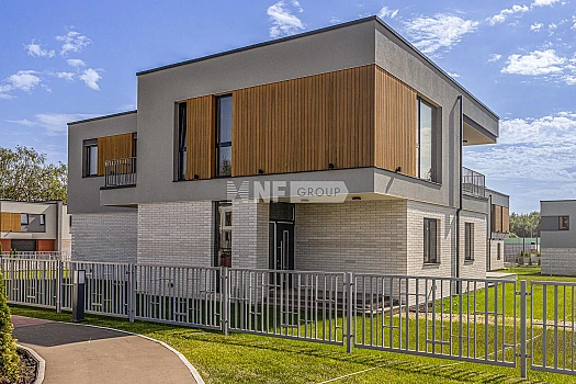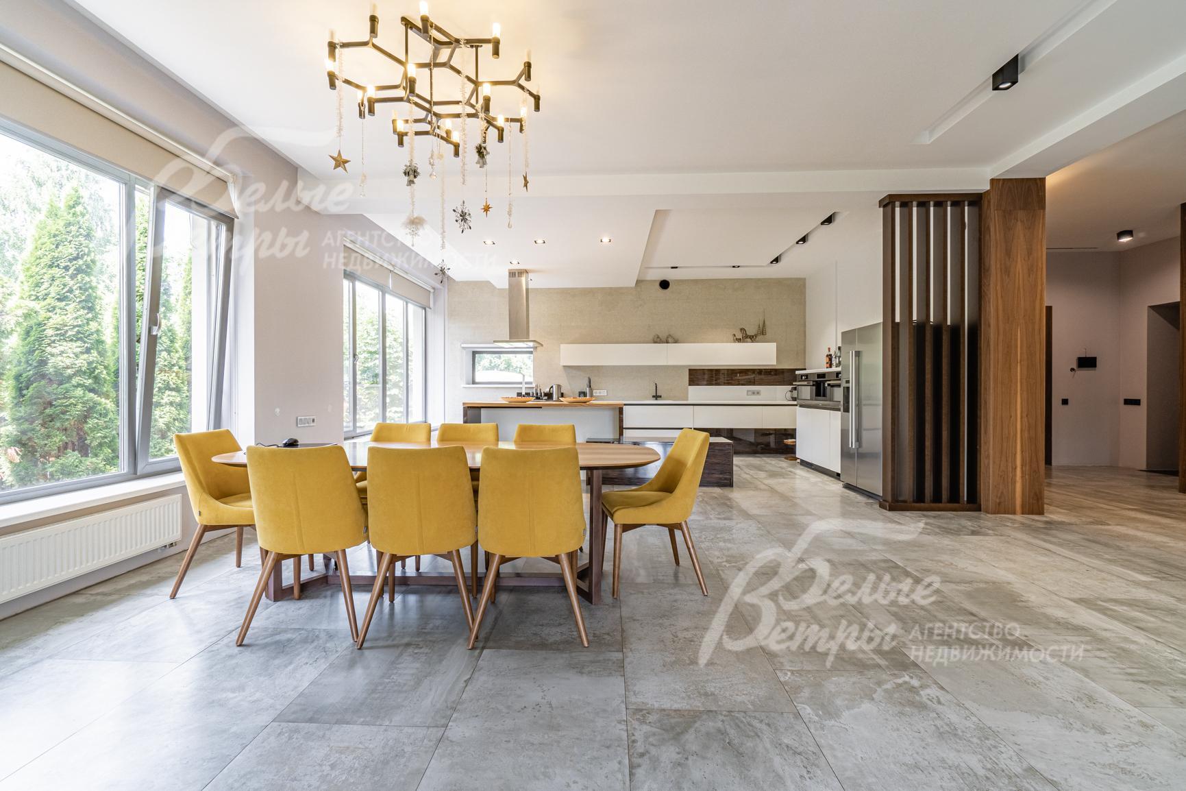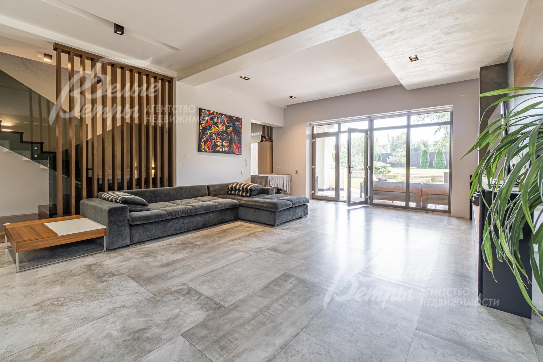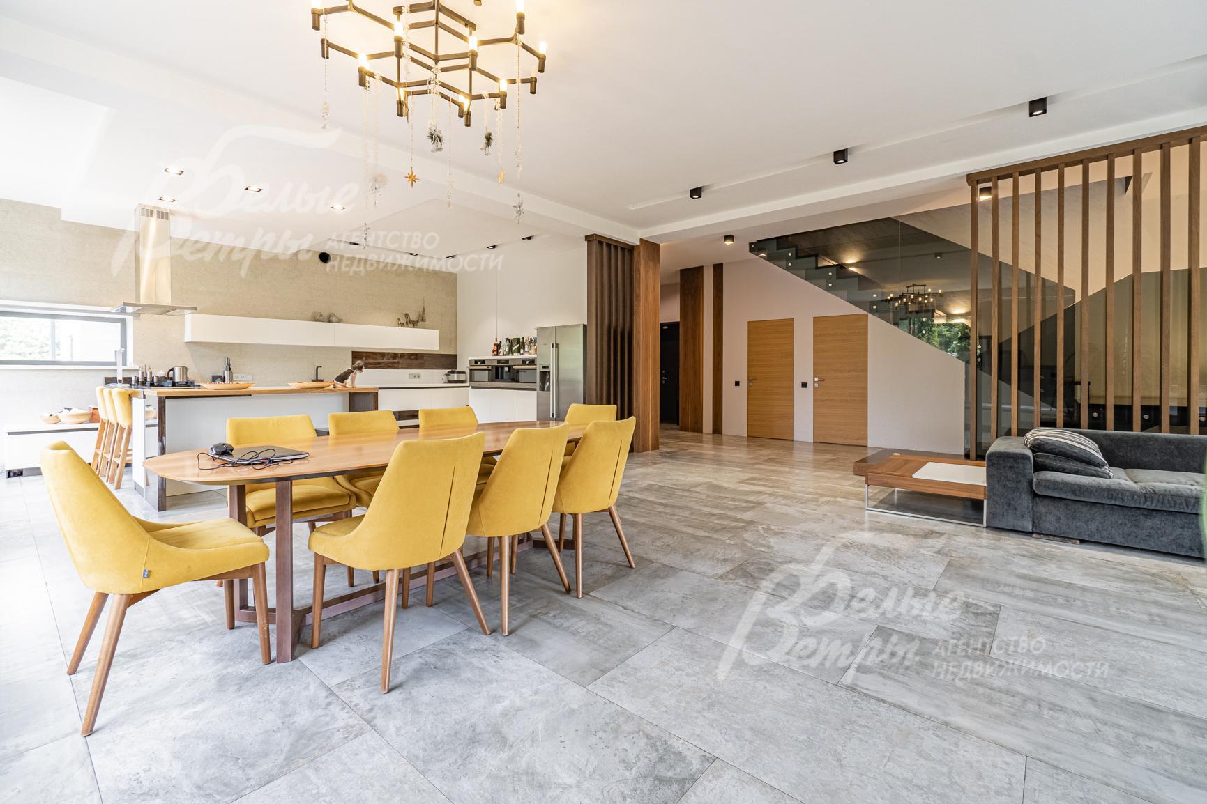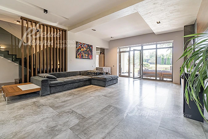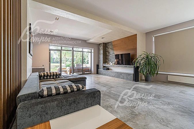 Внутренняя отделка: отделка выполнена в современном стиле с элементами минимализма. Стены отделаны декоративной (производитель San Marco, Италия) и художественной (ручной работы) штукатуркой, натуральным шпоном американского ореха (мастер-спальня, гардеробная при мастер-спальне, детская), амбарной доской (гостевая комната на 1-ом этаже), санузлы отделаны керамогранитом от компании Porcelanosa, отделка санузла при мастер-спальне - крупноформатной плиткой из керамогранита (150х90см, также от Porcelanosa). Мастер-спальня частично отделана дорогой художественной штукатуркой San Marco в 10 слоев и дорогим художественным шпоном ореха. Пространство около сауны - камень под травертин и доска из термо-осины, отделка сауны - парящие полки из термо-абаша, а стены из термо-осины (термически обработанное дерево обладает очень красивой фактурой и огромным сроком эксплуатации с сохранением первоначального внешнего вида. Пол в гостиной-кухне-столовой выполнен из дорогого керамогранита, полы санузлов отделаны плиткой Porcelanosa, часть полов в жилой зоне выполнены из паркетной доски из американского ореха и дуба. Полы в мастер-спальне - из инженерной доски (американский орех), полы в детской - из инженерной доски (дуб), полы в детской (с санузлом) выполнены из инженерной доски (орех), терраса и крыльцо - натуральный гранит, в гостевой спальне на первом этаже - ковролин. Лестница - широкая монолитная, ступени отделаны ясенем, ограждение - закаленное стекло. Потолки отделаны гипсокартоном, разноуровневые. В санузлах - ванный гарнитур Brenta, столешницы в санузле на 1 этаже и мастер-спальне выполнены из дерева (карагач), сантехника Laufen, Riho, Noken, Hansgrohe, Kludi. Отопление - все трубы и обвязки Rehau, радиаторы биметаллические, в зоне столовой-гостиной, мастер-спальни и детской - внутрипольные конвекторы. Теплые полы разведены по всей жилой зоне 1-го этажа, во всех санузлах 2-го этажа, в зоне сауны. Электрика - от известного элитного производителя ЦЕНТРОСВЕТ, розетки и выключатели Vimar и Legrand. Двери выполнены из шпона (дуб и ясень), высота 2,4м. Подоконники из искусственного камня Stonе..